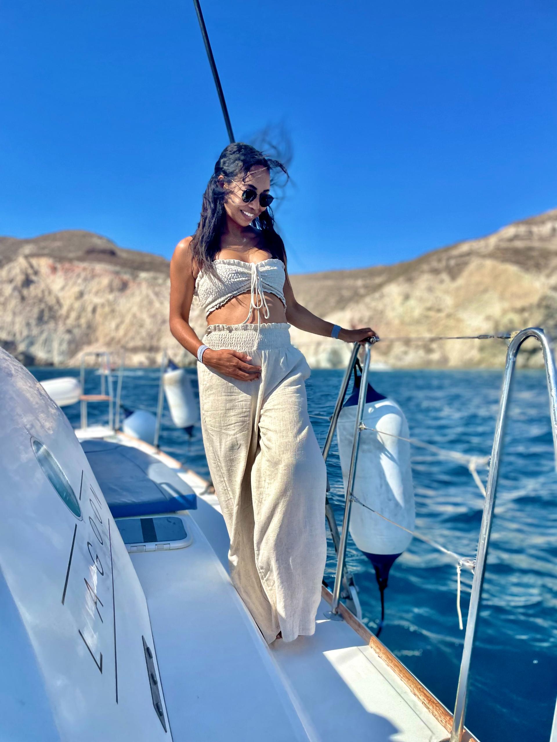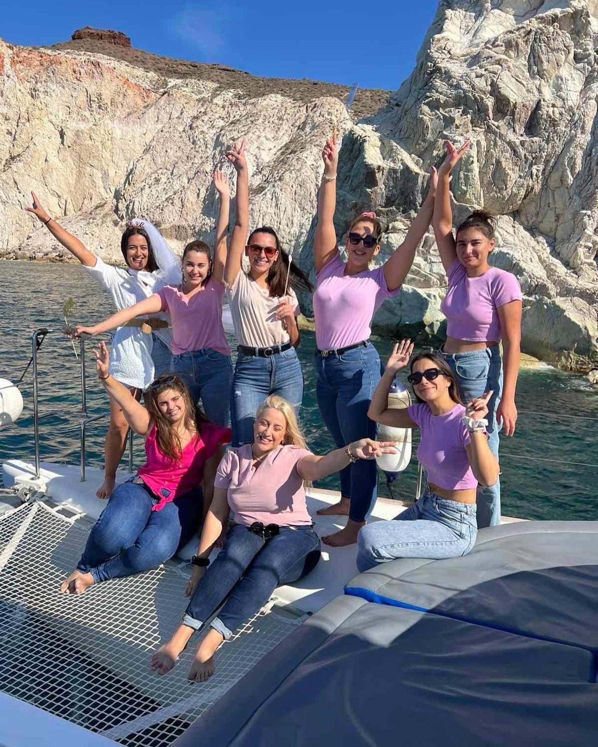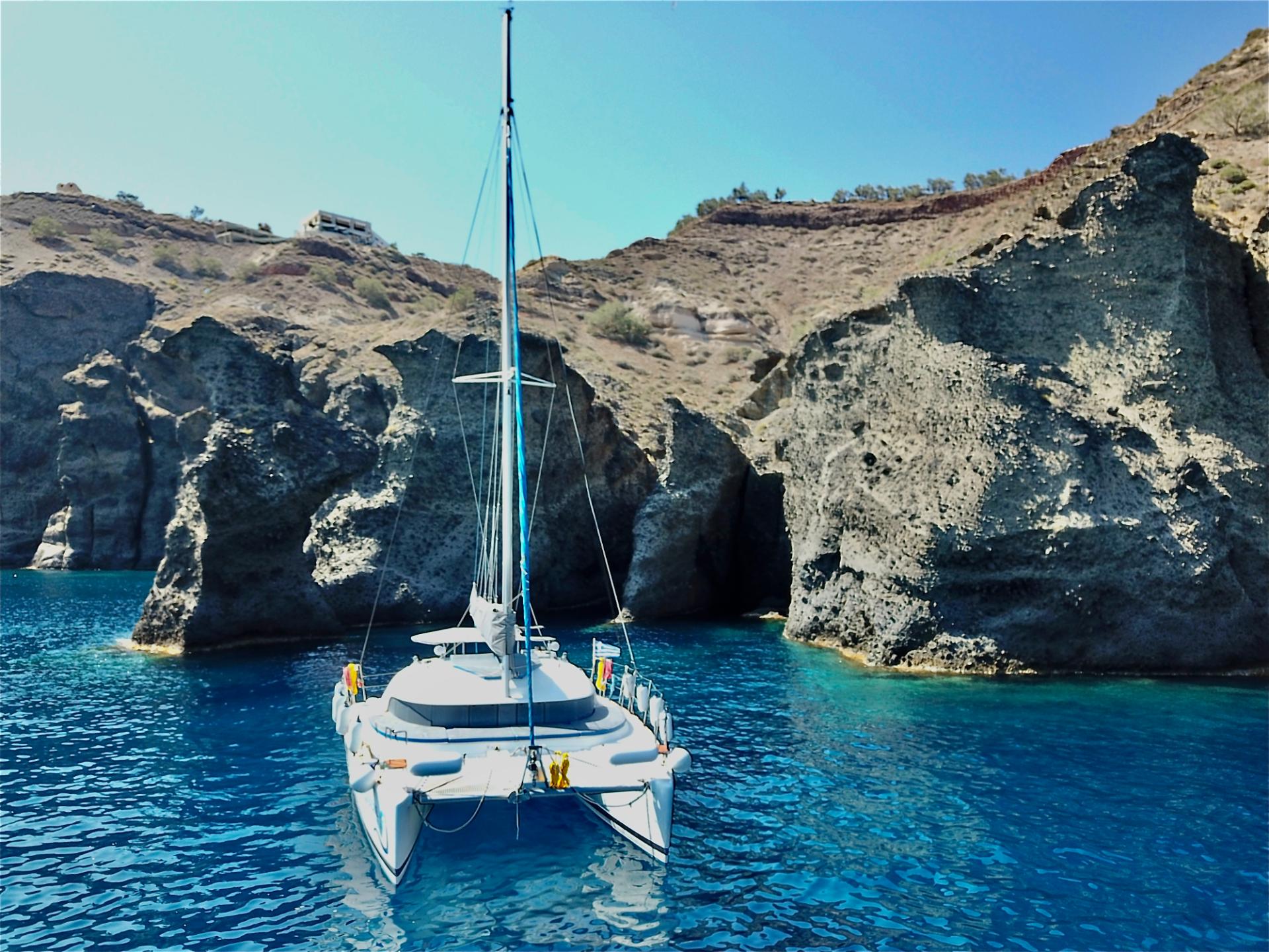 Embark on a captivating journey with your loved one, exploring the island’s majestic beauty in unparalleled luxury. Tailor your cruise with the captain for a bespoke experience, fulfilling all your desires. Our catamaran, designed for your utmost comfort, boasts high-quality sunbathing beds and abundant seating. Setting sail from and returning to the enchanting port of Vlychada, immerse yourself in the beauty of the most stunning beaches, indulging in crystal-clear waters. Revel in the provided amenities while sipping on a glass of champagne. Delight in an exquisite onboard BBQ featuring Santorinian delights, seafood, your chosen drinks, and conclude your journey with refreshing Greek yogurt paired with seasonal fruits and local honey for dessert. As you return, be captivated by the spellbinding sunset over the picturesque landscape of Santorini.